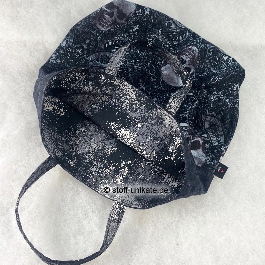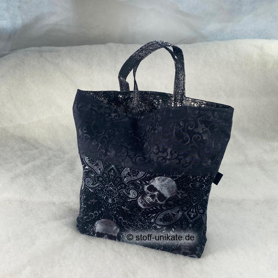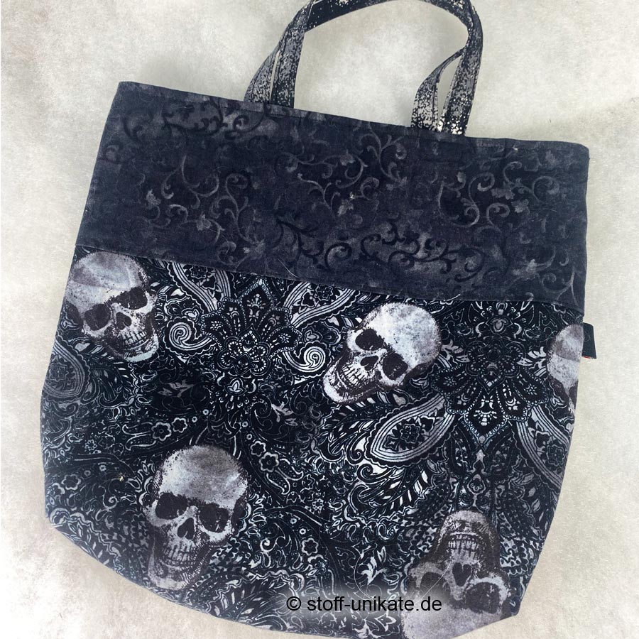 - Diese ausgefallene Büchertasche ist auf beiden Außenseiten im unteren Teil aus einem Designer-Baumwollstoff mit Totenkopf-/Gothic-Motiven und am oberen Teil aus einem schwarz-gemusterten Baumwollstoff gearbeitet