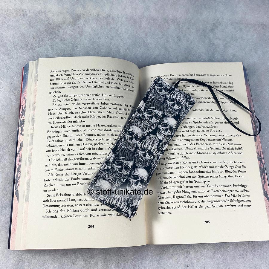 - Ein liebevoll genähtes Lesezeichen mit unterschiedlichen Totenkopf-Motiven auf beiden Seiten (siehe Fotos)