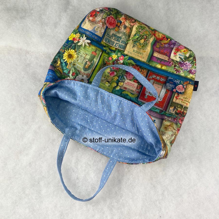 - Diese wunderschöne Büchertasche ist auf der Außenseite aus einem Designer-Baumwollstoff mit bunten Gartenbücher-Motiven und Schrift „Garden Flowers“ gearbeitet (siehe Fotos)
