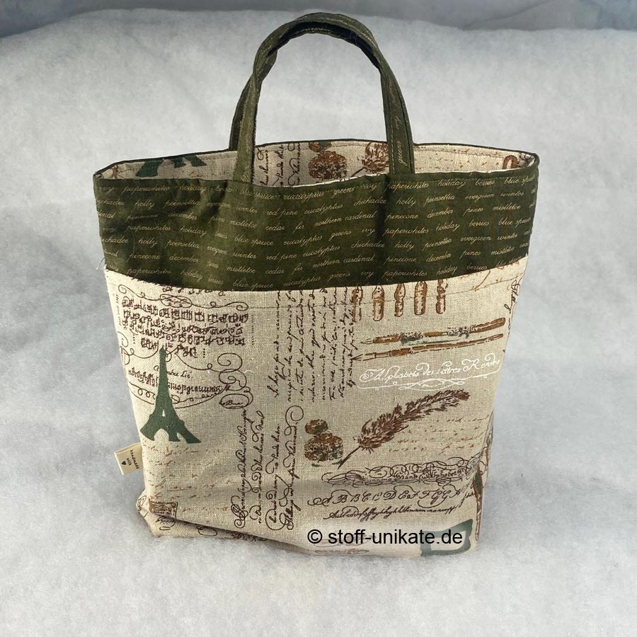 - Diese stilvolle Büchertasche ist auf der einen Außenseite im unteren Bereich aus einem beige-gemusterten Mischgewebe (mit Zeichen und Schriftmotiven) mit einer Eingriffstasche gearbeitet und im oberen Bereich aus einem Designer-Baumwollstoff in Olivgrün mit beigefarbenen Schriftzügen genäht (siehe Fotos)