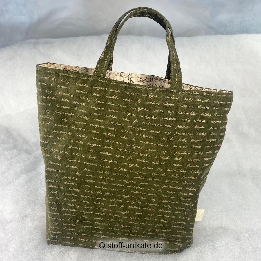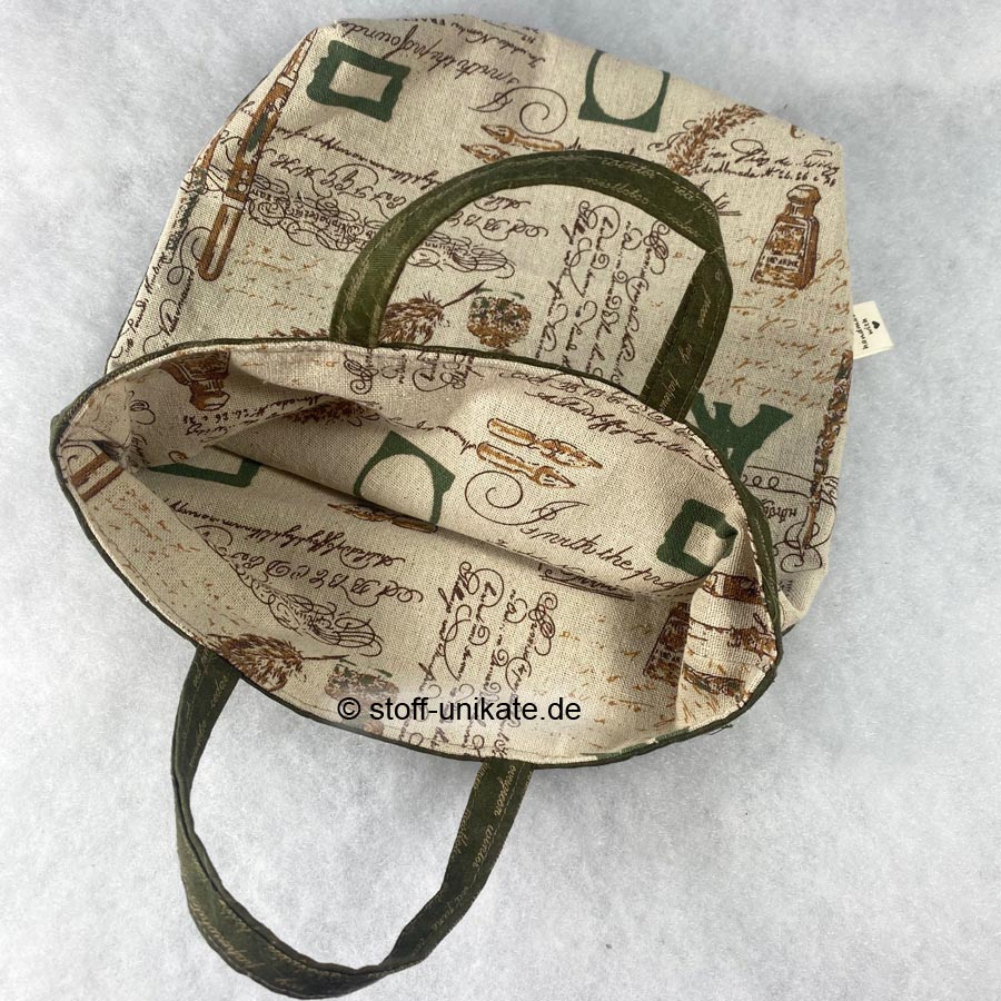- Die andere Außenseite ist komplett aus dem oliv-grünen Baumwollstoff mit beigefarbenen Schrift-Motiven gearbeitet
