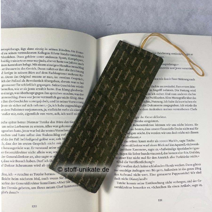 - Ein liebevoll genähtes Lesezeichen aus reinem Baumwollstoff in Oliv-grün mit beigefarbenen Schrift-Motiven auf beiden Seiten (siehe Fotos)
