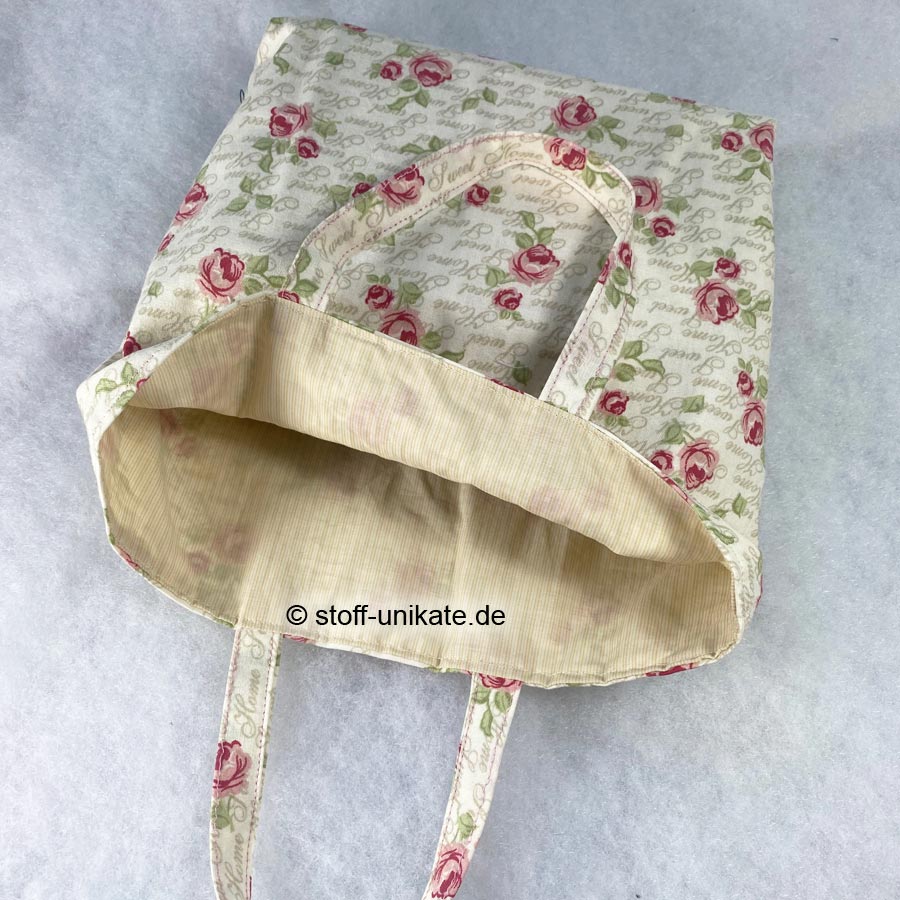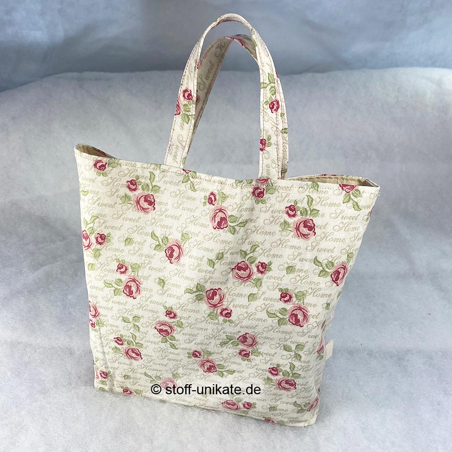 - Diese wunderschöne Büchertasche ist auf der Außenseite aus einem Designer-Baumwollstoff mit Rosenmotiven und Schrift „Sweet Home“ auf Creme gearbeitet (siehe Fotos)