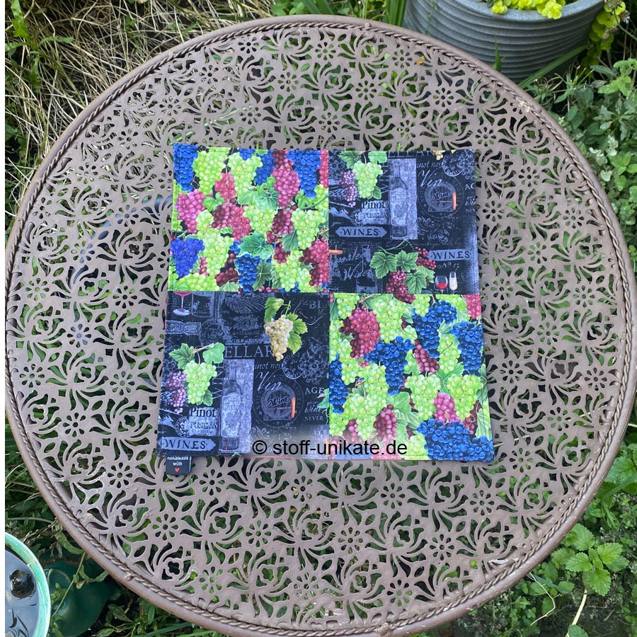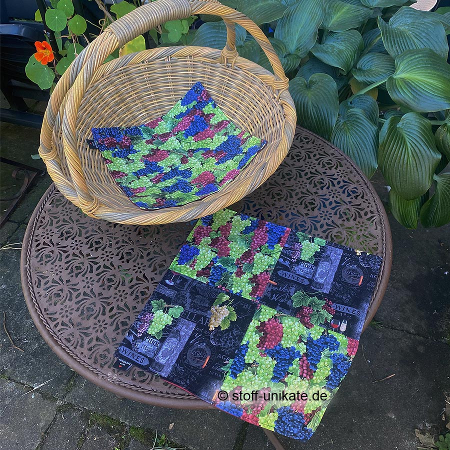 - Dieses 2-lagig gearbeitete Stoff-Deckchen habe ich auf der Vorderseite aus einem hochwertigen Designer-Stoff mit Weintrauben-Motiven gearbeitet