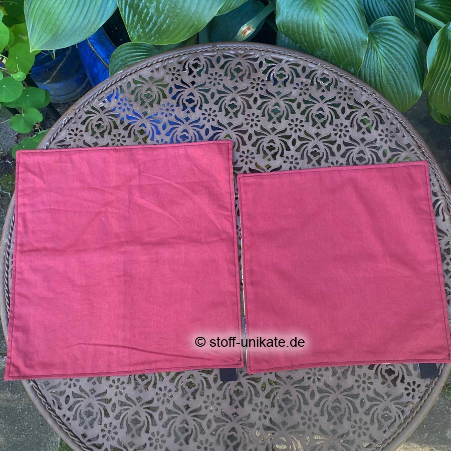 - Die Rückseite besteht aus einem einfarbigen, weinroten Baumwollstoff