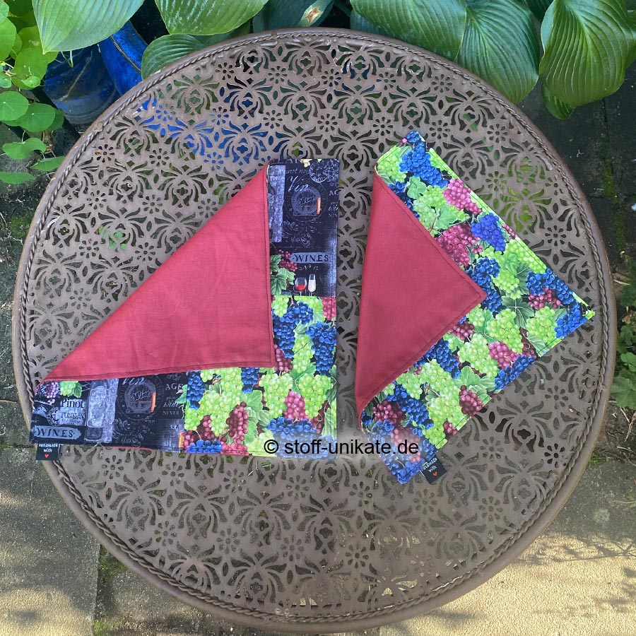 | Material: | Vorderseiten: Hochwertige Designer-Stoffe aus 100 % Baumwolle (Weintrauben + Wein-Motive) Rückseiten: Hochwertige Stoffe aus 100 % Baumwolle (einfarbig, weinrot) |