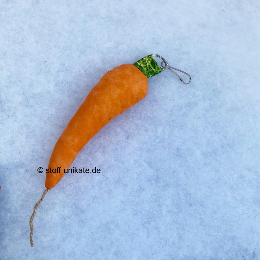d) Ein Schlüsselanhänger in Karotten-Form, von mir kreiert, genäht und gestopft mit Polyesterwatte sowie angenähtem Haken