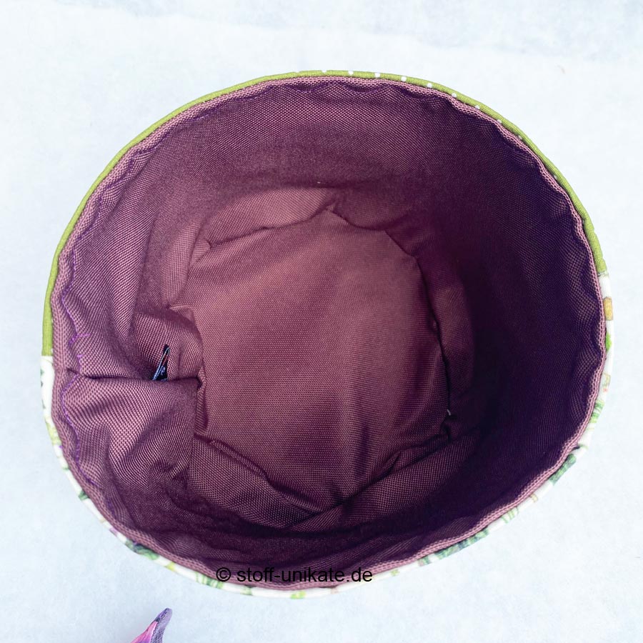 - Dieses Stoffkörbchen mit einem Durchmesser von ca. 15 cm ist an der Außenseite jeweils zur Hälfte aus einem Designer-Baumwollstoff von „acufactum“ mit verschiedenen Gemüsesorten-Motiven und zur anderen Hälfte mit einem gepunkteten, reinen Baumwollstoff in violett gearbeitet (siehe Fotos)