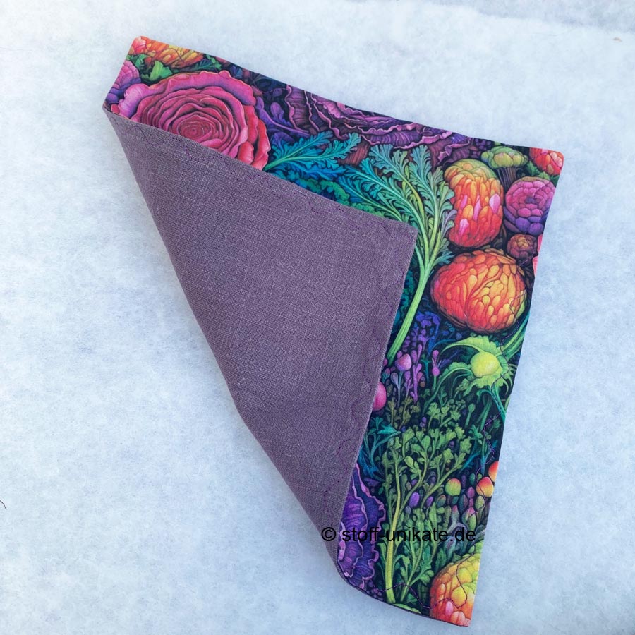 Eine Seite aus gemustertem Baumwollstoff mit Gemüsemotiven, die andere Seite aus einfarbigem Baumwoll-Leinen-Mischgewebe in violett genäht