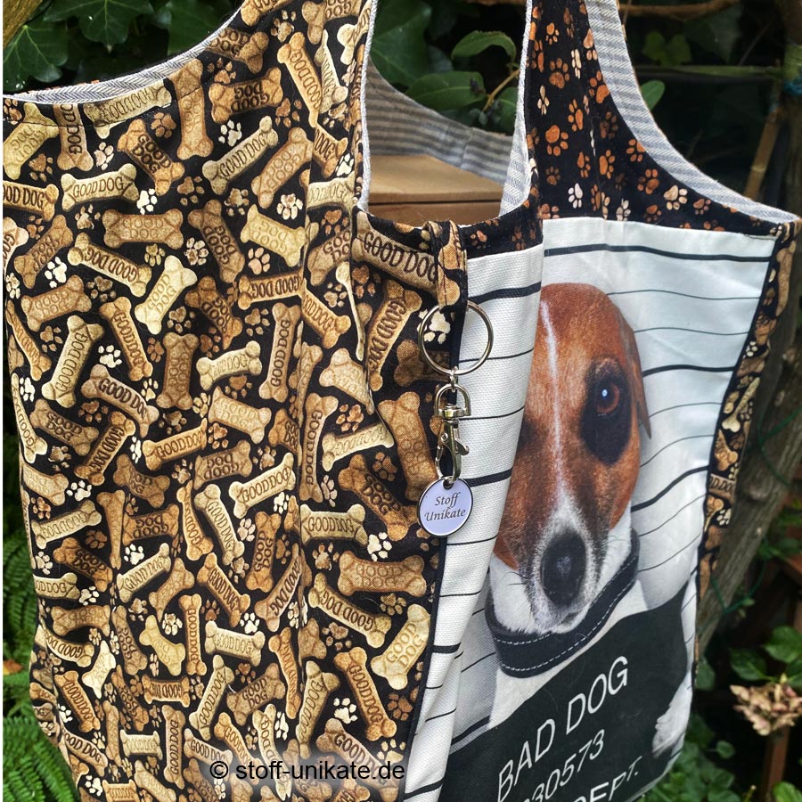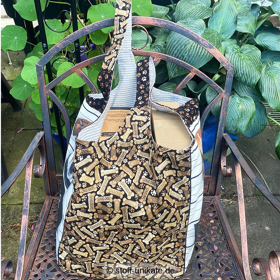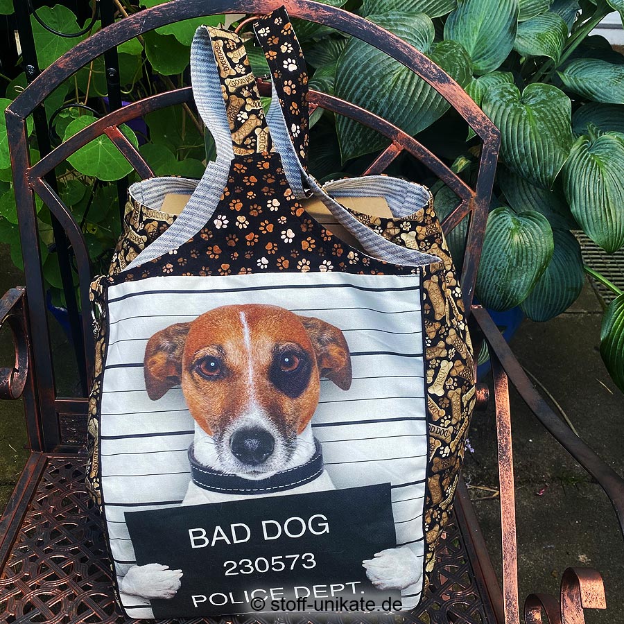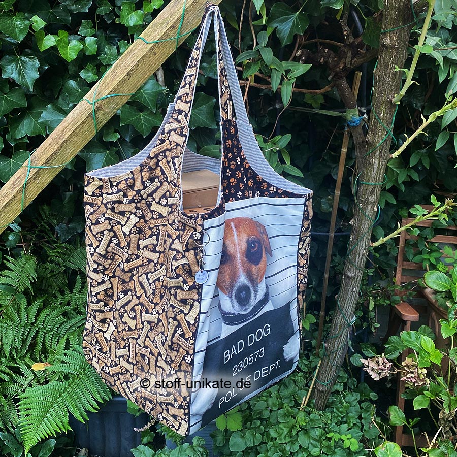 - Diese große Jumbo-Einkaufstasche ist außen aus einer Stoffkombination mit einem Hundemotiv aus Canvas und Baumwollstoffen gearbeitet und mit ca. 4 cm breiten Henkeln versehen