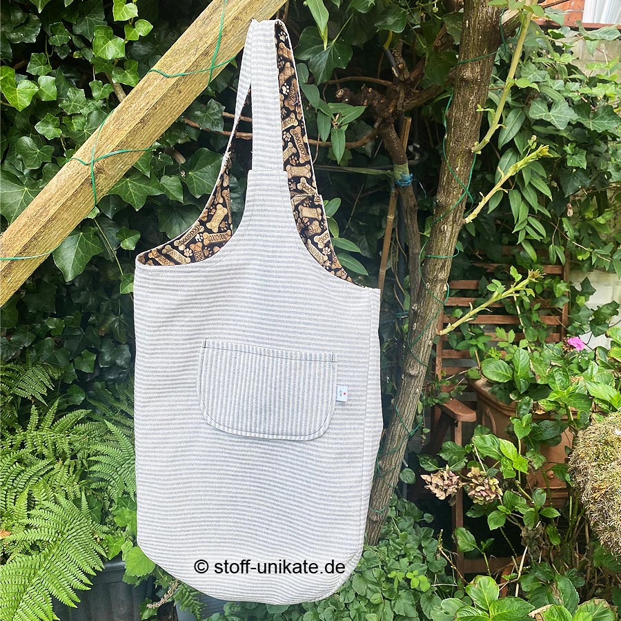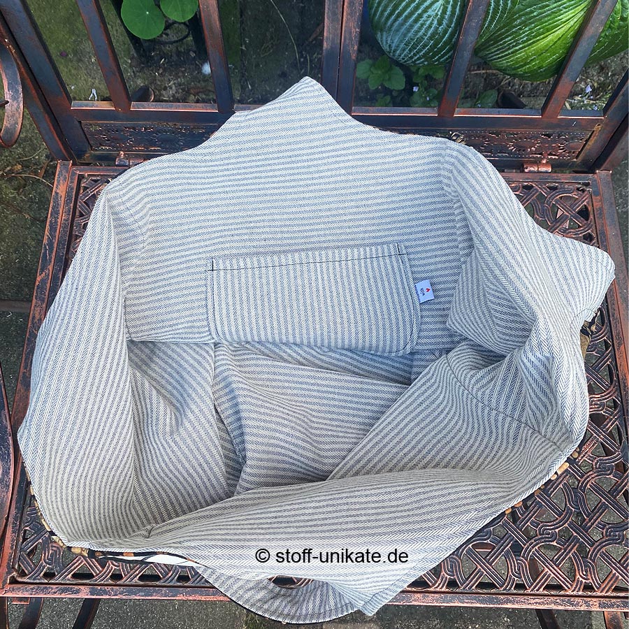 - Der Shopper ist innen mit einem gewebten Dekostoff mit hellgrauen Streifen abgefüttert und kann auch als Wendetasche benutzt werden
