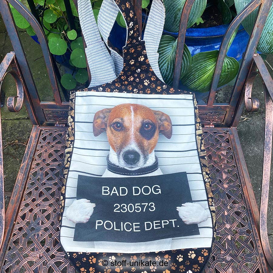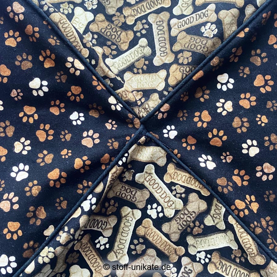 - Jeweils zwei Seiten bestehen aus der Stoffkombination mit Hundemotiv und braun-schwarzen Pfoten und zwei Seiten sind komplett aus einem hochwertigen Baumwollstoff mit Knochen- und Pfoten-Motiven sowie Schriftzügen in schwarz-braun gearbeitet (siehe Fotos)