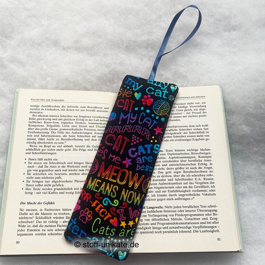 - Ein liebevoll genähtes Lesezeichen aus hochwertigen Baumwollstoffen beidseitig mit bunter Schrift