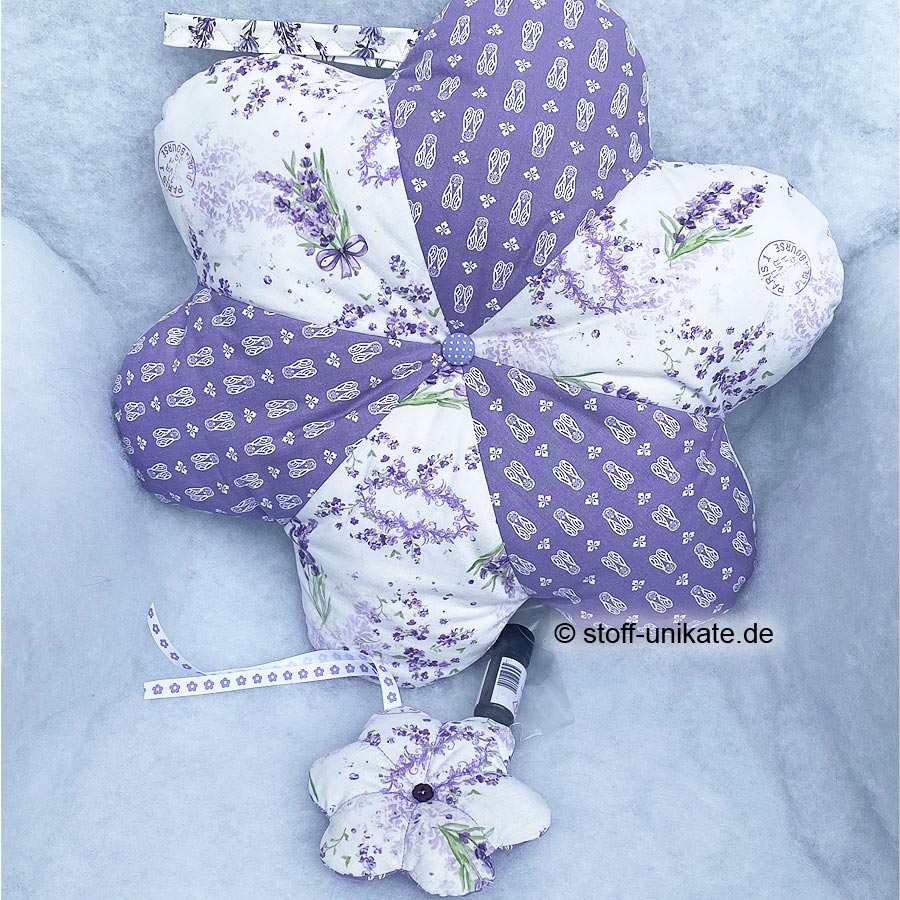 - Dieses bezaubernde Kissen-Set bestehend aus einem großen Deko-Kissen sowie einem kleinen Duft-Kissen in Blumenform ist ein betörendes Geschenk für alle Liebhaber von Lavendelblüten und Provence-Liebhaber!