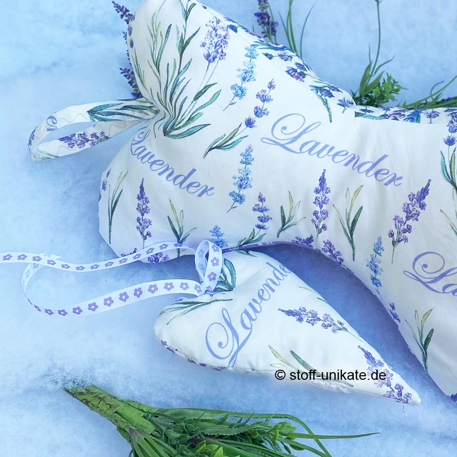 - Das dazugehörige Duft-Herz mit einer Länge von ca. 17 cm ist ebenfalls aus dem Baumwollstoff mit Lavendel-Motiven genäht und mit einer Mischung aus reinen Lavendelblüten aus der französischen Provence sowie zertifizierter Polyesterwatte gefüllt