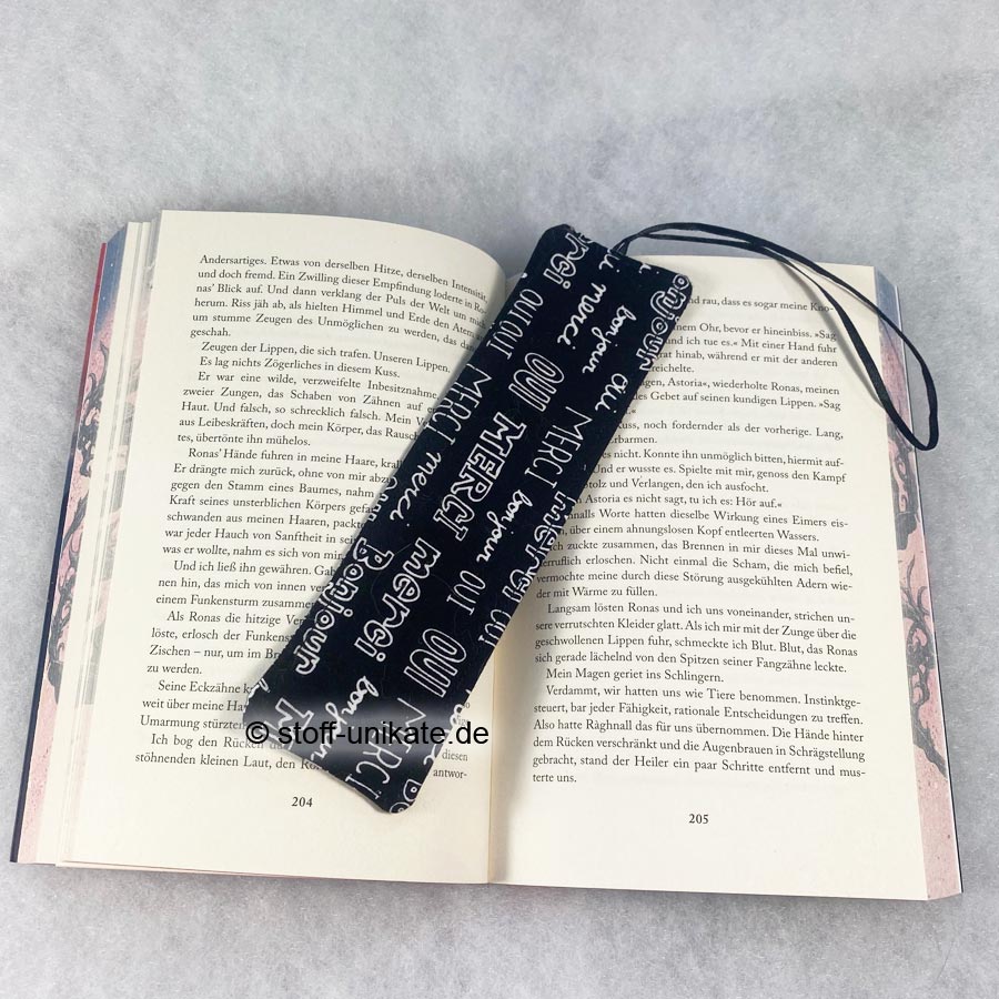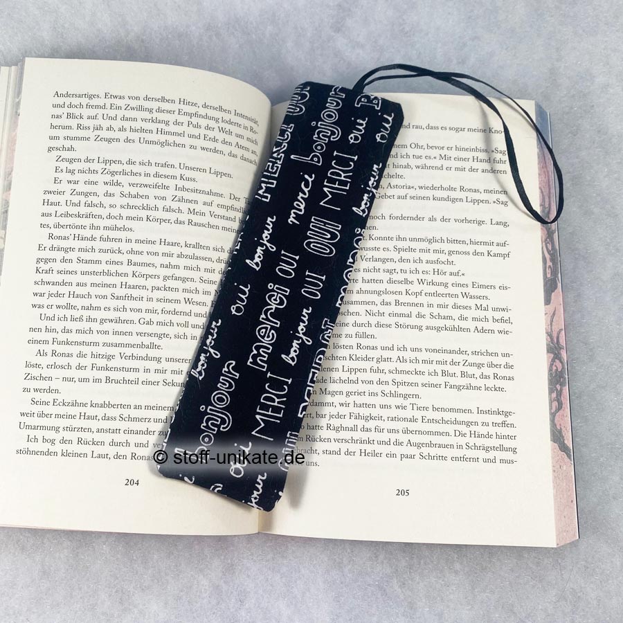 - Ein liebevoll genähtes Lesezeichen aus hochwertigen Baumwollstoffen beidseitig mit weißer Schrift auf Schwarz