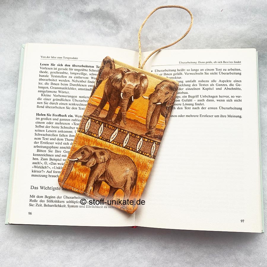 Elefanten, Afrika, Safari, gold, gelb, Bücher Leseratte, Buchliebhaber, Bücherwurm, Bücherfan, Bücherei, mehrfarbig, beige, braun, Lesezeichen, Buchzeichen, Stoff, Geschenk, Geschenkidee, Mitbringsel, Unikat, handmade, Einzelstück