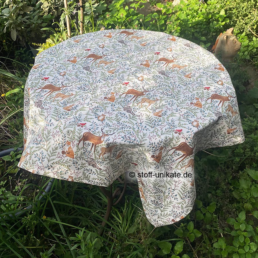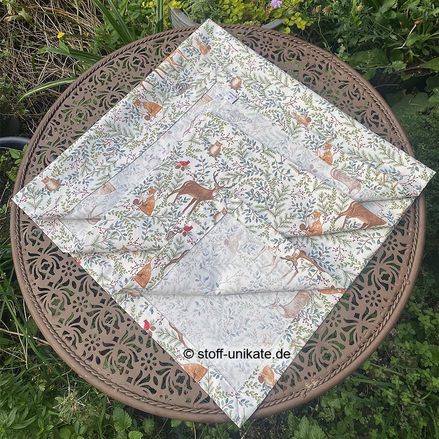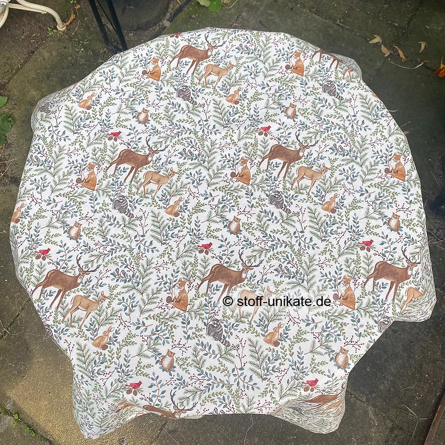 Vorweihnachtliche Mitteldecke/Tischdecke mit vielen Waldtieren, genäht aus hochwertiger Designer-Baumwolle. Auch eine schöne Geschenkidee zur Weihnachtszeit. Größe ca. 86 x 86 cm +/-. Weitere Infos siehe unten.