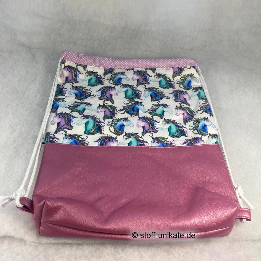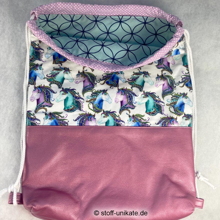 Hier die Details zum gefütterten Turnbeutel für Kinder „Bunte Pferde“: