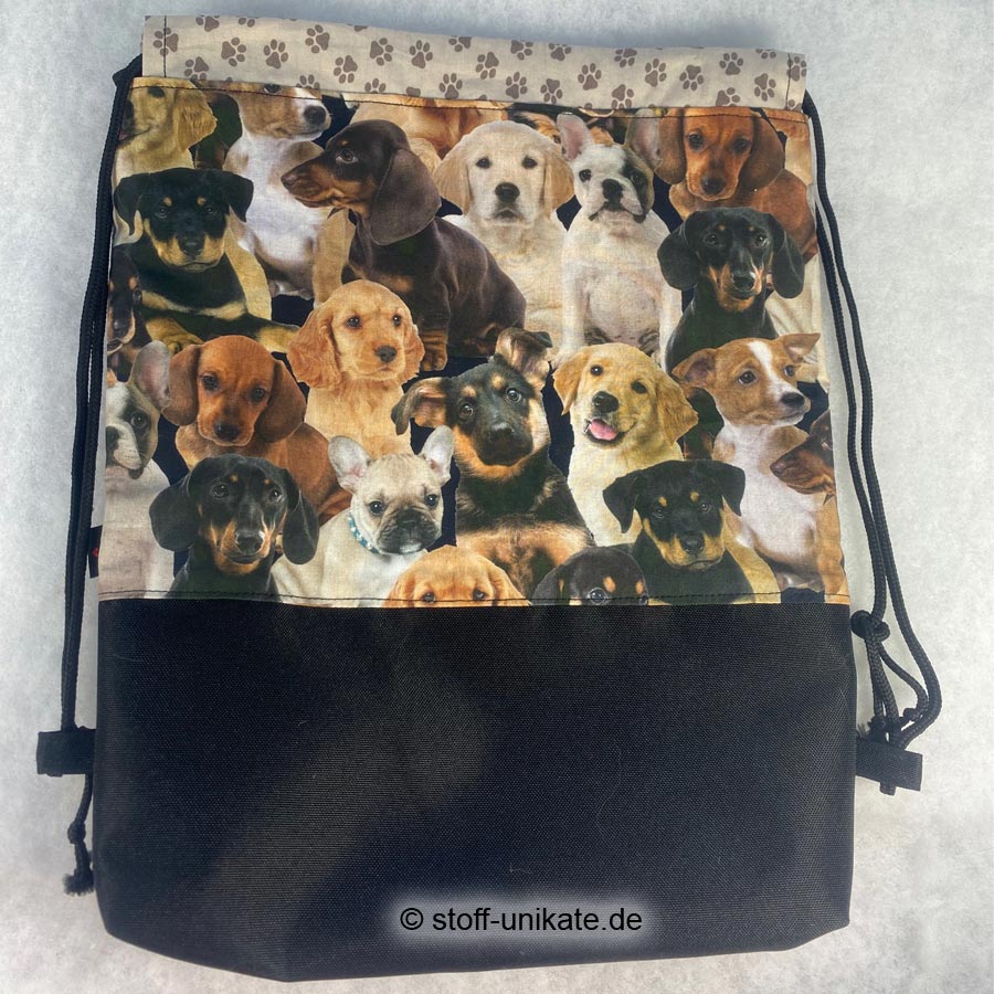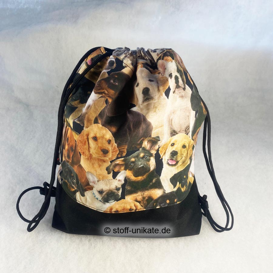 - Die Außenseite von diesem einmaligen Stoffbeutel ist im oberen Teil aus einem reinen Baumwollstoff mit Hundewelpen-Motiven in Kombination mit einem wasserabweisenden Stoff aus 100 % Polyester im unteren Bereich gearbeitet (siehe Fotos).