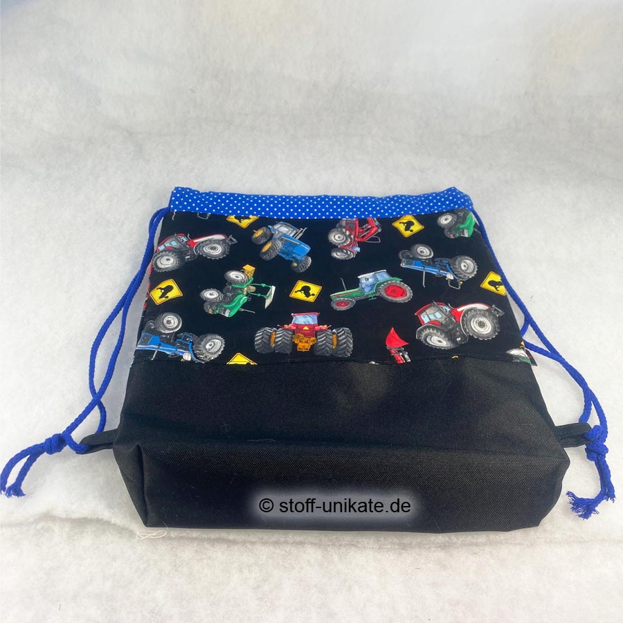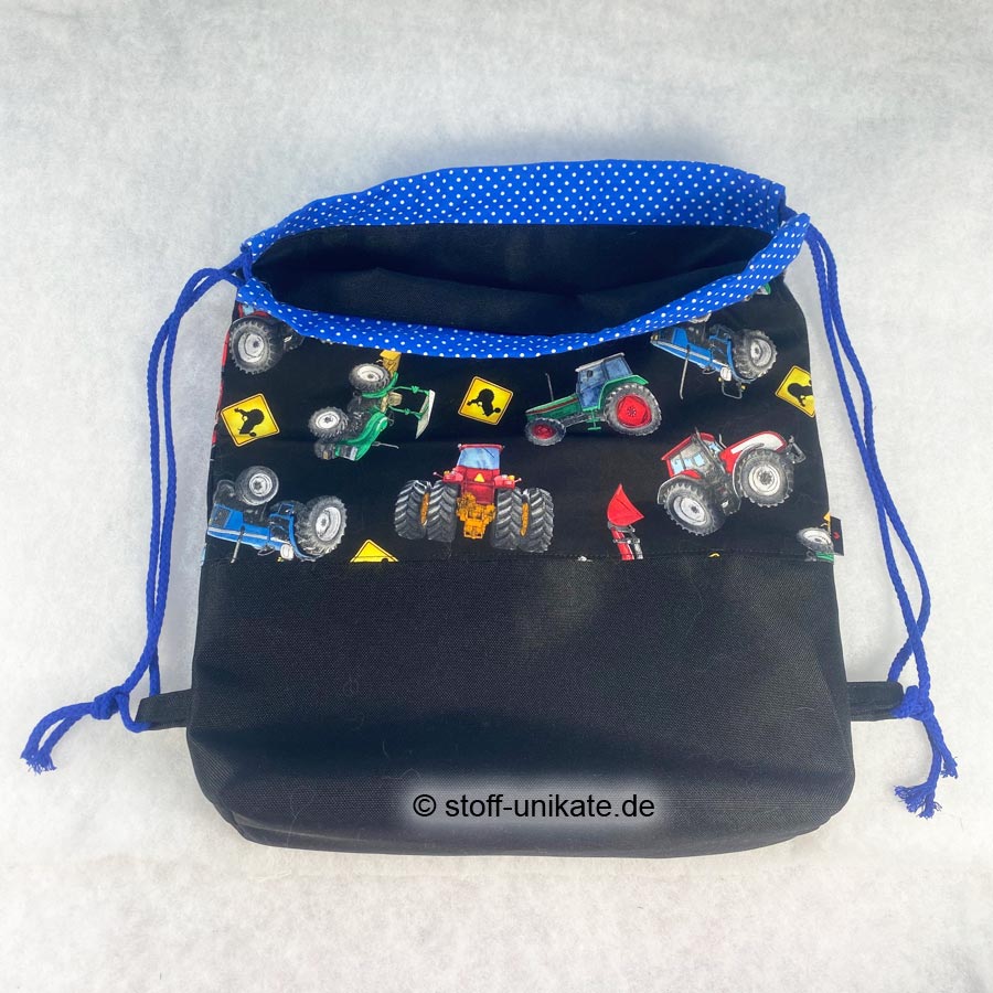 Einmaliger Turnbeutel für Kinder in einer Stoffkombination aus reiner Baumwolle und wasserabweisendem Stoff mit Trecker-Motiven. Innen komplett mit wasserabweisendem Stoff abgefüttert. Größe; ca. 33 x 36 x 6 cm (B x H x T). Ein schönes Geschenk für Bauernhof-Fans. Weitere Infos siehe unten.