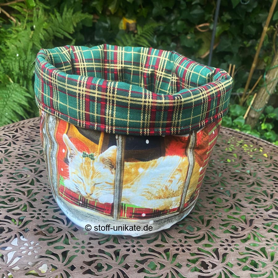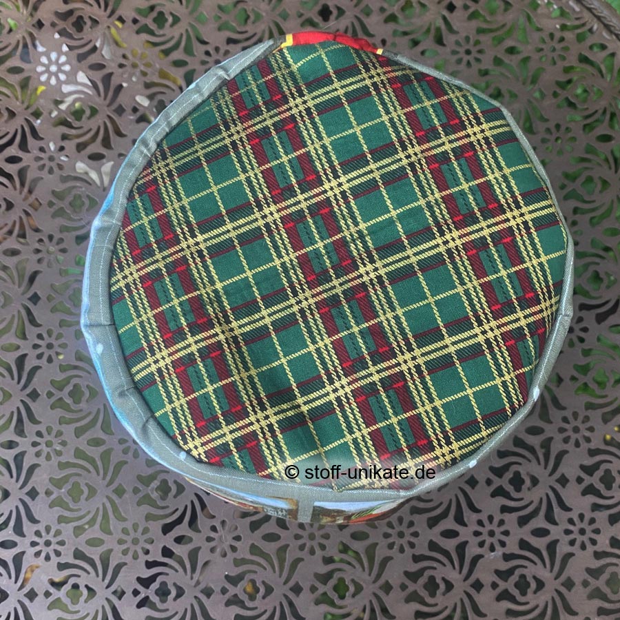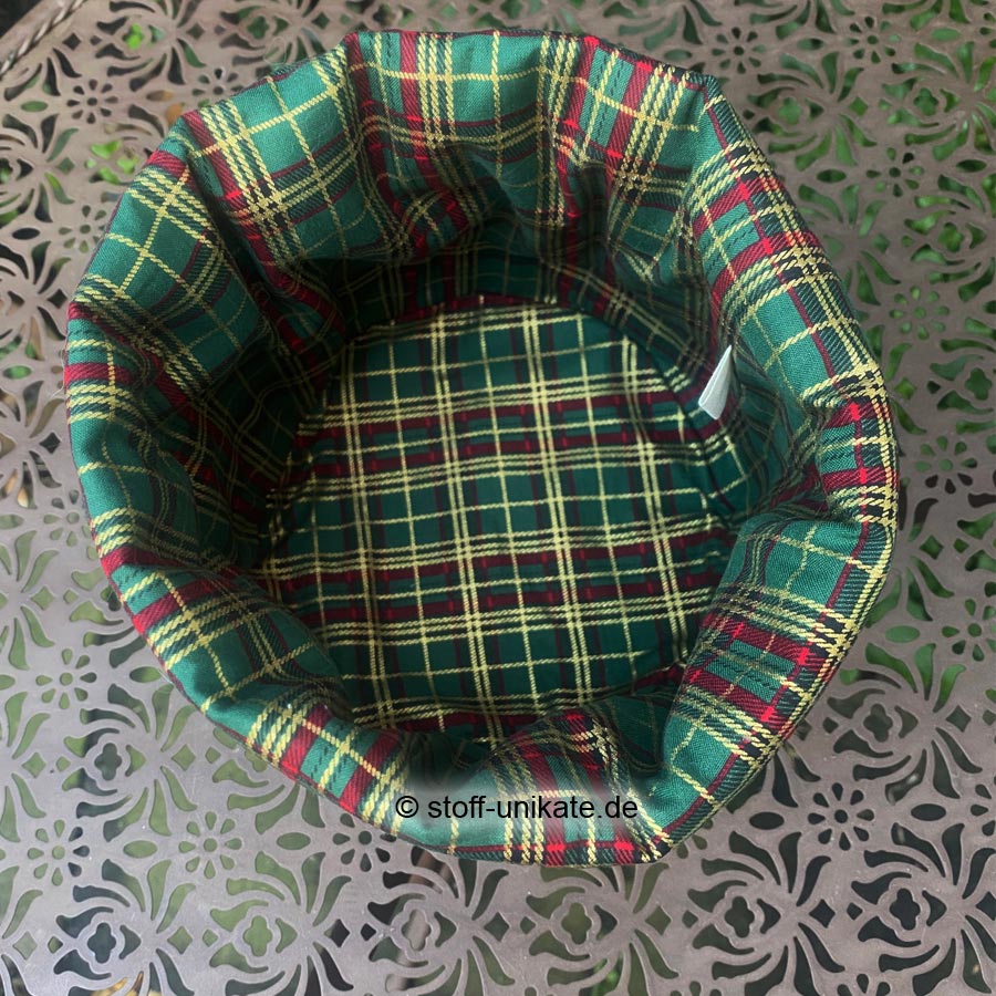 - Innen und am Außenboden ist der Stoffkorb mit einem rot-grün-gold-karierten Baumwollstoff abgefüttert